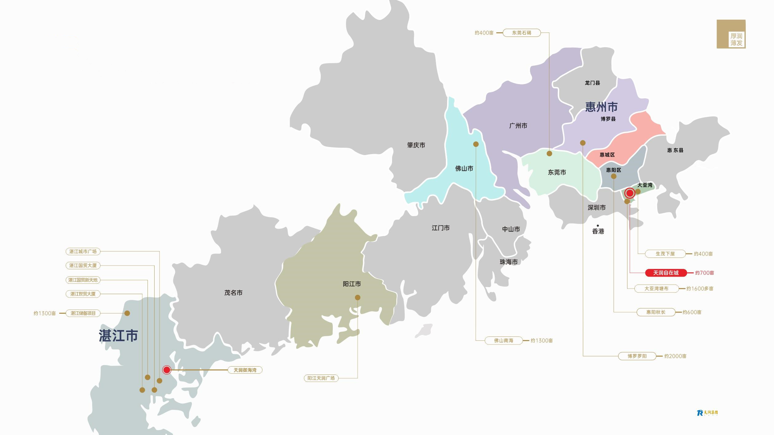 天潤(rùn)聚焦大灣區(qū)的更新改造,通過(guò)收并購(gòu)、留用地合作開(kāi)發(fā),“三舊”改造(城市更新)等獲取土地資源。截止2020年,天潤(rùn)在大灣區(qū)已儲(chǔ)備土地面積7000余畝。充足的土地儲(chǔ)備為天潤(rùn)實(shí)現(xiàn)持續(xù)性發(fā)展奠定了夯實(shí)的基礎(chǔ)。