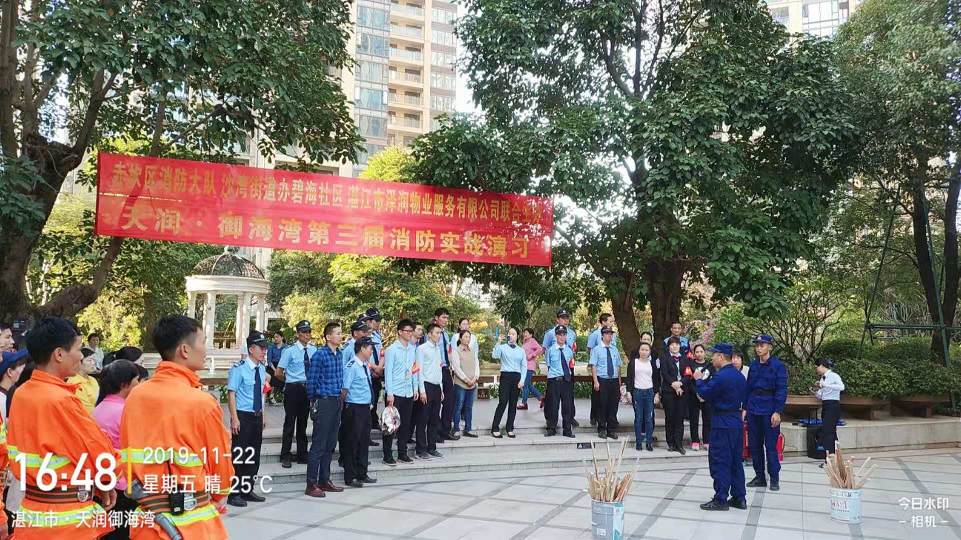2019年1122日,澤潤物業(yè)與赤坎區(qū)消防大隊、沙灣街道辦聯(lián)合舉辦御海灣第三屆消防實戰(zhàn)演習(xí),集團公司領(lǐng)導(dǎo)、地產(chǎn)公司領(lǐng)導(dǎo)參與及指導(dǎo)本次演習(xí)工作。